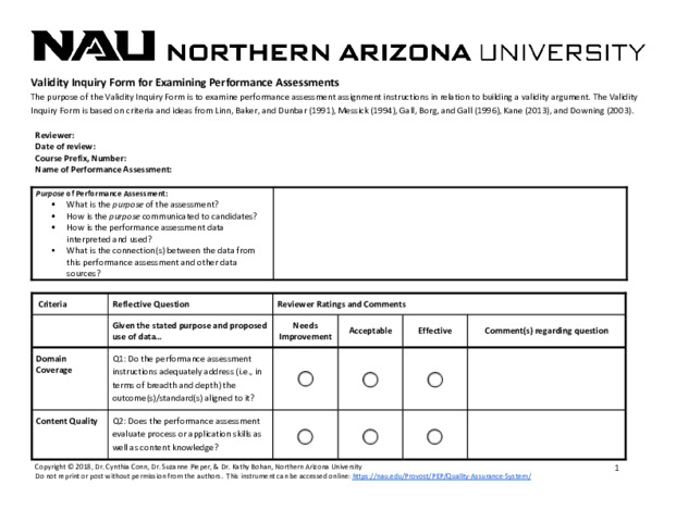 Canipe, Marti and Conn, Cynthia and Bohan, Kathy J and Vezino, Beau Appendix A Validity Inquiry Form for Examining Performance Assessments. In: Recipe for Success: Building a Sustainable Quality Assurance System. Emerald Publishing. (In Press)